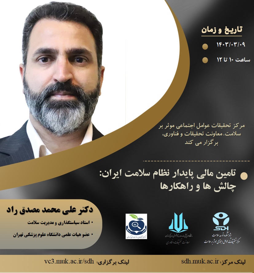 🔘 تاریخ برگزاری: چهارشنبه 9 خرداد 1403 🔘 ساعت برگزاری: 10 الی 12 🔘 سخنران: دکتر علی محمد مصدق راد ( استاد سیاست گذاری و مدیریت سلامت دانشگاه علوم پزشکی تهران )  |