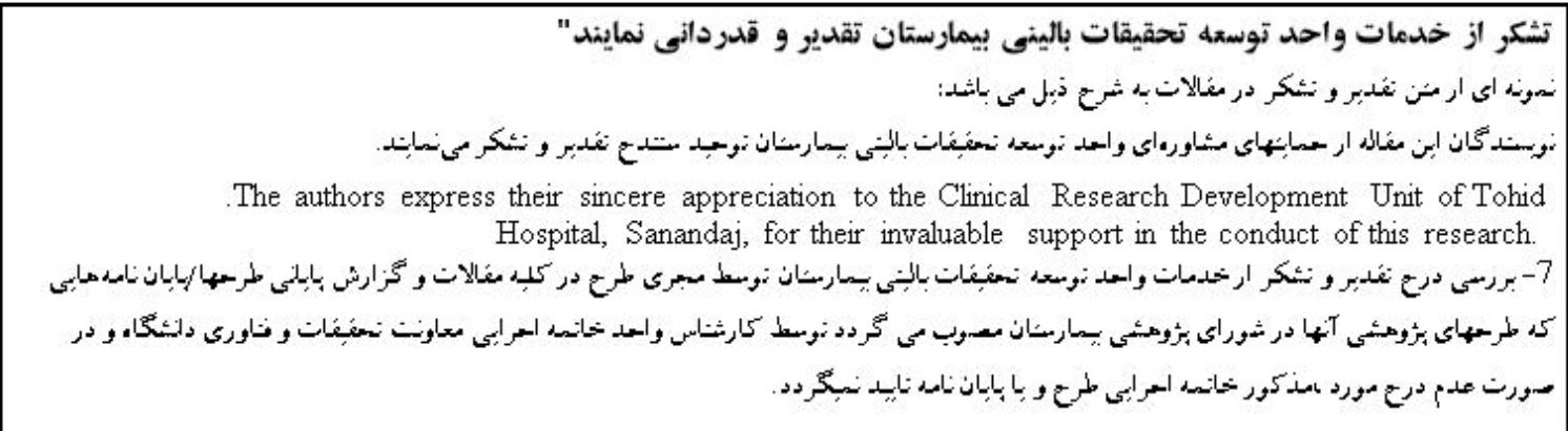 خود را میگذرانند لازم است در بند تقدیر و تشکر نام واحد توسعه تحقیقات بالینی بیمارستان بعثت یا در بخش افیلییشن ؛ نام بیمارستان بعثت ذکر